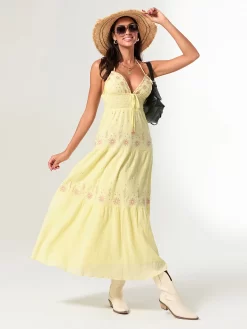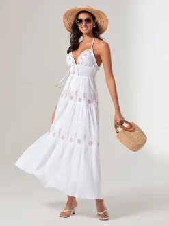 Women Summer Casual Long Dress Flower Embroidery Tie-Up Halter Neck Sleeveless Dress Fashion Backless A-line Dress
