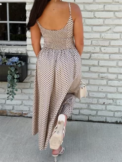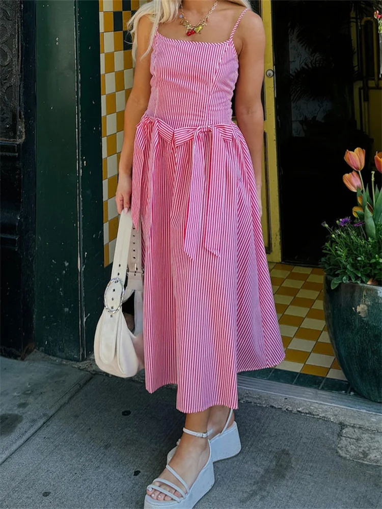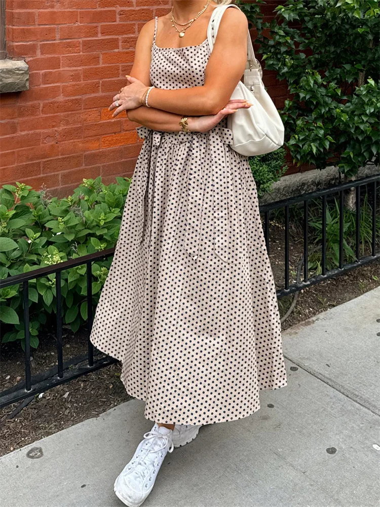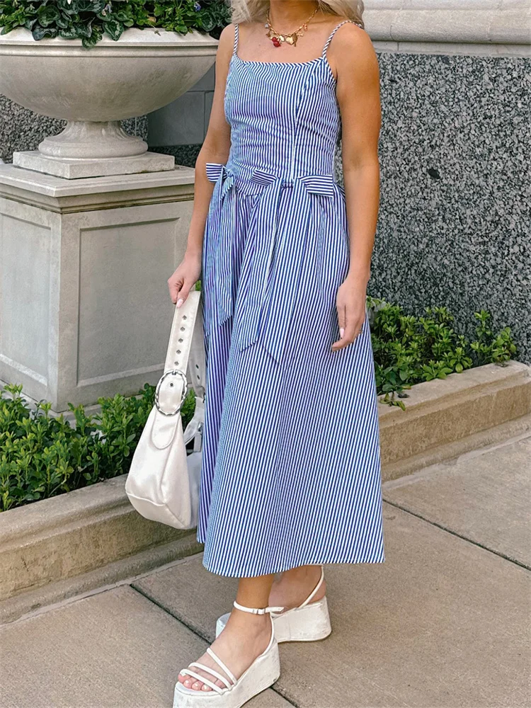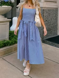 Women’s Bow Long Dress Summer Sleeveless Spaghetti Strap Stripes/Dots Print Dress Flowy Dress